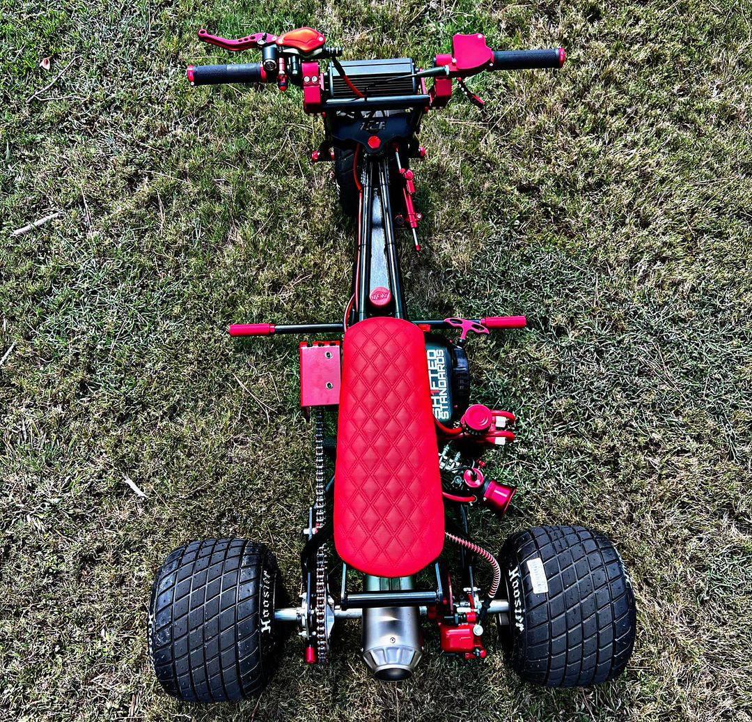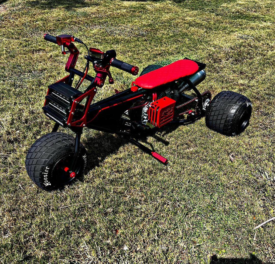 The custom red and black color scheme gives this mini trike a premium and sporty look. A performance exhaust system enhances both sound and efficiency, making every ride more exciting.